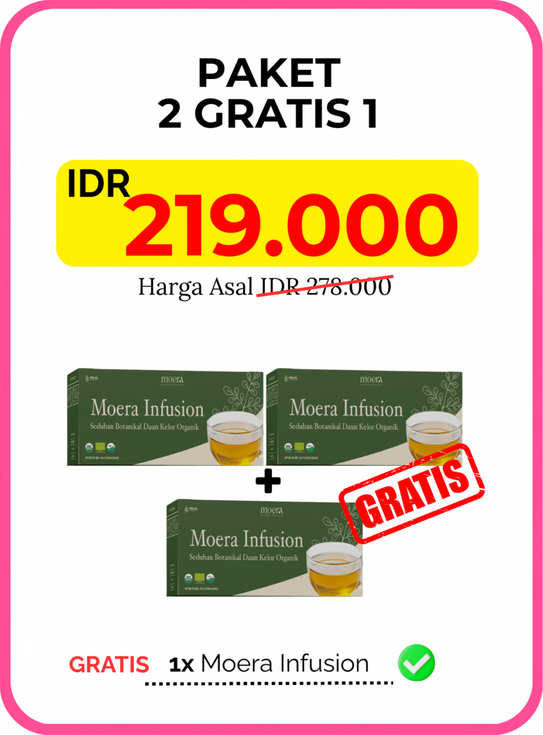 Ya, ada! Anda berhak atas 100% pengembalian dana jika tidak melihat hasil setelah konsumsi rutin selama 60 hari. Kami beri jaminan karena yakin dengan keberkesanan Moera Infusion.
