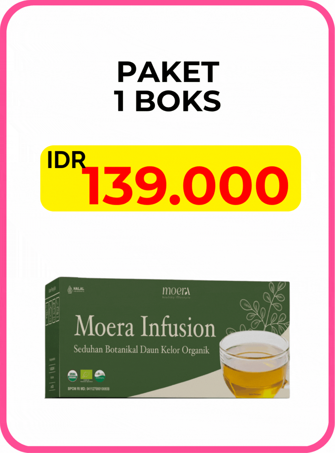 Minum 1 sachet sebelum atau sesudah makan. Seduh dengan 100–200 ml air. Konsumsi 2–3 kali sehari untuk hasil yang optimal. Jadikan Moera sebagai minuman harian untuk bantu turunkan berat badan lebih cepat.