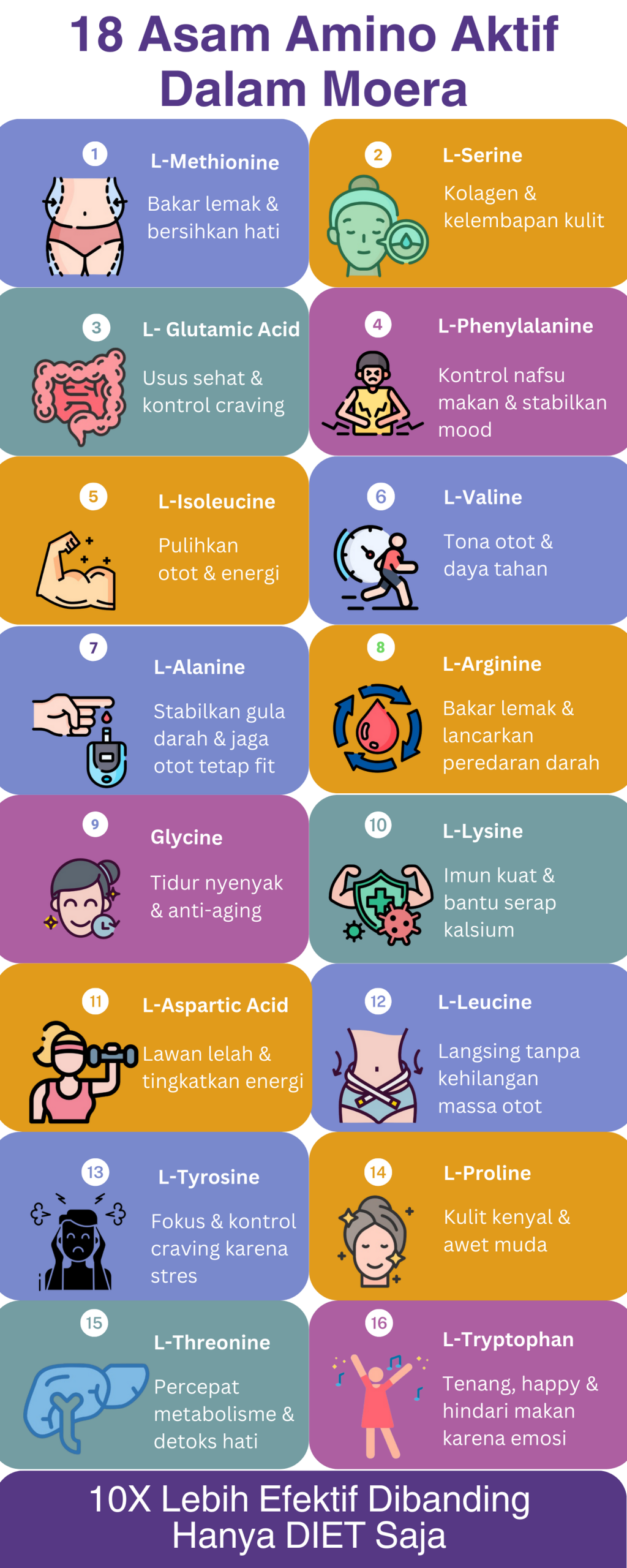 Plus, Moera juga punya 18 jenis asam amino aktif yang tetap utuh bantu rawat kulit & energi tubuh sambil nurunin berat.
